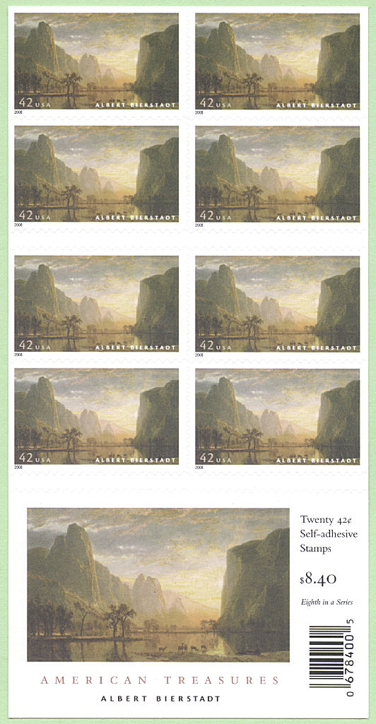 On August 14, 2008, in Hartford, Connecticut, the Postal Service™ will issue a 42-cent, Albert Bierstadt commemorative stamp in one design in a pressure-sensitive adhesive (PSA) double-sided booklet of 20 (Item 678400). Designed by Derry Noyes of Washington, DC, the stamp goes on sale nationwide August 14, 2008. For this eighth issuance in the American Treasures stamp series, art director Derry Noyes of Washington, DC, used Valley of the Yosemite, an 1864 oil-on-paperboard painting by Albert Bierstadt. It belongs to the Museum of Fine Arts, Boston. Inaugurated in 2001 with the Amish Quilts stamp pane, the American Treasures series is intended to showcase beautiful works of American fine art and crafts. The 2002, 2003, and 2004 issuances featured artwork by John James Audubon, Mary Cassatt, and Martin Johnson Heade, respectively. The theme returned to textiles with the issuance of the New Mexico Rio Grande Blankets stamp booklet in 2005 and the Quilts of Gee’s Bend booklet in 2006. The 2007 issuance featured a leaded Favrile-glass window designed by Louis Comfort Tiffany. | ||
