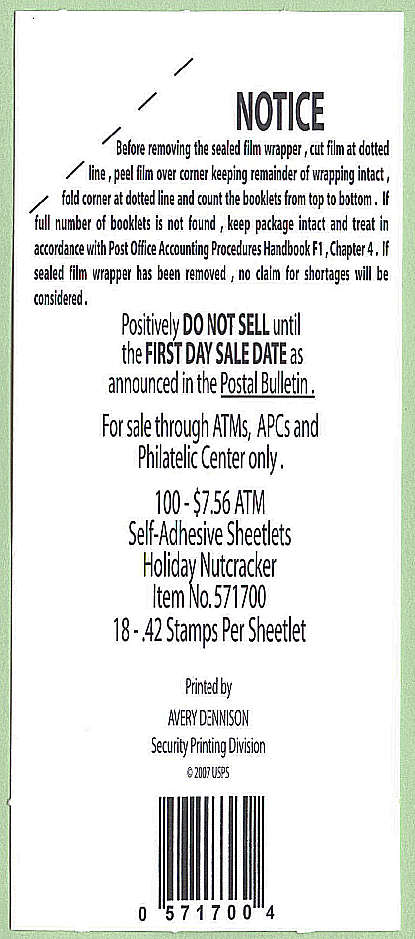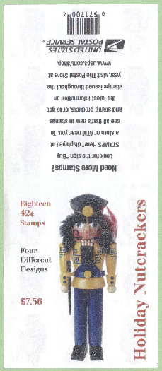 Non-stamp Side: Promotional Text • Barcode “571700” • Holiday Nutcrackers image • "Holiday Nutcrackers" • “Eighteen 42¢ Stamps" • "Four Different Designs” • Price “$7.56” | ||||||
