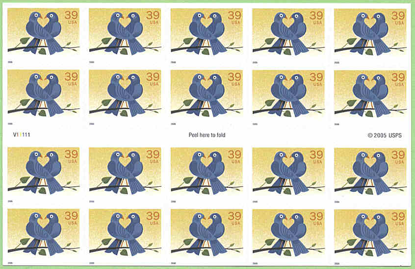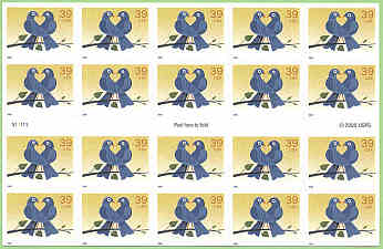 The Postal Service™ will issue a 39-cent Love: True Blue special stamp, on May 1, 2006, in Washington, DC. The stamp designed by Craig Frazier of Mill Valley, California, goes on sale nationwide May 2, 2006. The stamp will be issued in a pressure-sensitive adhesive (PSA) convertible booklet of 20 (Item 675200). Illustrator Craig Frazier arranged paper cutouts into a composition depicting two birds perched on a branch sharing a devoted gaze - the space between them forms a heart. He then created a digital file of the artwork and applied shades of blue to the birds, setting them against a yellow background. |