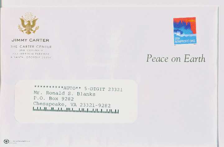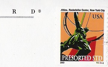 | Justin Dreiseszun sent a scan of the (10¢) Atlas with plate combination V11222 that he found on a piece of bulk business mail and which was reported here on January 27, 2005. |