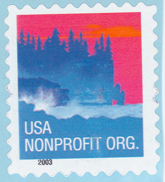 white writing on the stamp (USA NONPROFIT ORG.)"