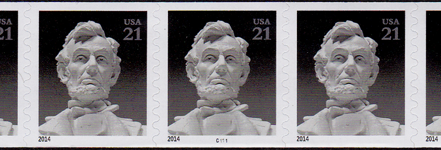 | Official Announcement | On February 12, 2014, in Springfield, Illinois, the U.S. Postal Service® will issue a 21-cent Abraham Lincoln (second-ounce rate)definitive stamp, in one design in a pressure-sensitive adhesive (PSA) pane of 20 stamps (Item 116800) and a coil of 100 (Item 774400) produced by CCL Label Inc. The stamp will go on sale nationwide February 12, 2014. The Postal Service™ honors Abraham Lincoln with this new stamp issued at the second-ounce rate for envelopes and mailings that require additional postage. The stamp features a black-and-white photograph with a close-up view of the statue of Abraham Lincoln by sculptor Daniel Chester French that is housed inside the Lincoln Memorial in Washington, DC. The image is slightly cropped to showcase the President’s rugged facial features. Carol M. Highsmith took the original photograph. Art director Derry Noyes designed the stamp. To learn more about the stories behind the stamps, visit https://www.usps.com/stamps/. |
