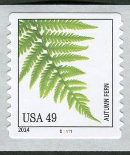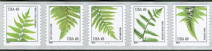 49¢ Fortune’s Holly Fern coil stamp 49¢ Soft Shield Fern coil stamp 49¢ Autumn Fern coil stamp (The plate number is on this stamp) 4851 49¢ Goldie’s Wood Fern coil stamp 4852 49¢ Painted Fern coil stamp Strip of 5 |