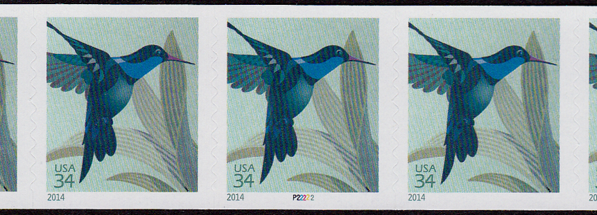 | Official Announcement | On February 7, 2014, in Kansas City, Missouri, the U.S. Postal Service® will issue a 34-cent Hummingbird stamp, (the new postcard rate stamp), in one design in a pressure-sensitive adhesive (PSA) pane of 20 stamps (Item 117200) and the other in a coil of 100 (Item 774600) produced by Ashton Potter. The stamp goes on sale nationwide February 7, 2014. The stamp will feature a blue-tinted, highly stylized, digital image of a hummingbird, a type of bird that uses its extra long bill and tongue to sip nectar from tubular flowers. Nancy Stahl illustrated the stamp, under the direction of Carl T. Herrman. To learn more about the stories behind the stamps, visit https://www.usps.com/stamps/. |