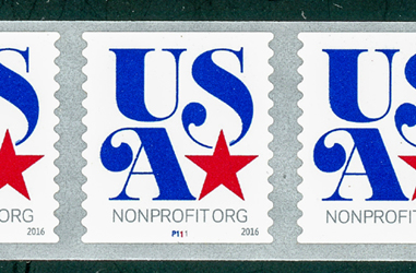 | Official Announcement | On April 28, 2016, in Dulles, VA, the U.S. Postal Service® will issue the USA nondenominated, nonprofit organization stamp (5-cent value), in one design, in a pressure-sensitive adhesive (PSA) coil of 10,000 (Item 777500).