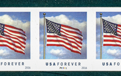 | Official Announcement | On January 29, 2016, in Washington, DC, the U.S. Postal Service® will issue the U.S. Flag First-Class Mail® stamp (Forever® priced at 49 cents), in one design. The formats available are a pressure-sensitive adhesive (PSA) booklet of 10 stamps (Item 679100) produced by security printer Banknote Corporation of America/SSP (SSP), a PSA booklet of 20 stamps (Item 680500) produced by security printers Ashton Potter (USA) Ltd (APU) and SSP, and a PSA coil of 100 stamps (Item 787300) produced by security printers APU and SSP. The stamp will go on sale nationwide January 29, 2016. The American flag has long symbolized the strength and spirit of our nation. This U.S. Flag First-Class Mail Forever stamp features a detail of Emmanuel Faure’s vivid photograph of a flag waving against the background of the sky. Greg Breeding designed the stamp. Terrence W. McCaffrey was the art director. |