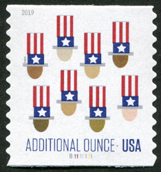 | Official Announcement | On January 27, 2019, in Kansas City, MO, the U.S. Postal Service® will issue the Uncle Sam’s Hat (Non-denominated additional ounce rate) stamp in one design (with new format), in a pressure-sensitive adhesive (PSA) coil of 100 stamps (Item 746900). The stamp will go on sale nationwide January 27, 2019, and must not be sold or cancelled before the first-day-of-issue. |
