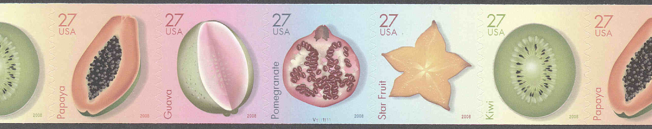 Papaya Guava Pomegranate - Plate Number on this stamp Star fruit Kiwi Strip of 5, Plate # V1111111, on the Pomegranate stamp. |