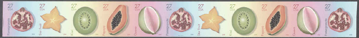 | Official Announcement | On April 25, 2008, in Burlingame, California, the Postal Service™ will issue 27-cent, Tropical Fruit definitive stamps in five designs. Designed by Ethel Kessler of Bethesda, Maryland, the stamps go on sale nationwide April 25, 2008. The stamps will be available in the following formats: