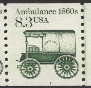 See also Scott #2231 (1986) on which "Ambulance 1860s" is 18 mm long. For a side-by-side comparison of the Ambulance stamps, click here. |