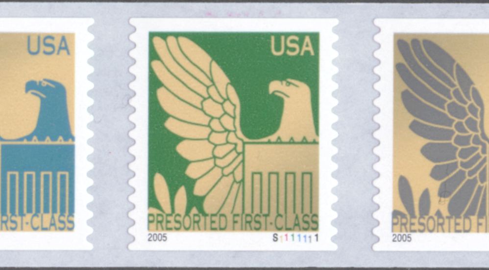 | Official Announcement | The Postal Service™ will issue nondenominated (25-cent value), American Eagle Presorted First-Class Mail stamps (Item 782800) in a pressure-sensitive adhesive (PSA) coil of 3,000 on August 5, 2005, in Grand Rapids, Michigan (APS Stamp Show). The stamps, designed by Tom Engeman of Brunswick, Maryland, go on sale nationwide August 6, 2005. The American Eagle definitive stamp was previously issued on May 12, 2004, in a water-activated gum coil of 3,000 (Item 782500) and on June 26, 2003, in a pressure- sensitive adhesive (PSA) coil of 10,000 (Item 782100). |