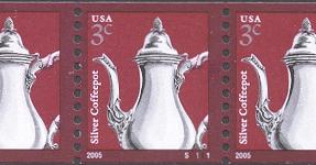 | Official Announcement | The Postal Service™ will issue a 3-cent, Silver Coffeepot definitive stamp (Item 782900) in one design, in a water-activated gum (WAG) coil of 10,000, on September 16, 2005, in Milwaukee, Wisconsin (MILCOPEX Stamp Show). The stamp designed by Derry Noyes of Washington, DC, goes on sale nationwide on September 17, 2005. For this sixth issuance in the American Design series, artist Tania Lee of Washington, DC, chose the coffeepot as the subject of this new stamp featuring a watercolor and gouache painting of a pear-shaped silver coffeepot with a carved wood handle that was made circa 1786 in Philadelphia. Inaugurated in 2002 with the American Toleware stamp, the American Design series showcases beautiful works of American art and crafts. The 2002 issuance featured American Toleware, followed by American Clock and Tiffany Lamp (2003), and Chippendale Chair and Navajo Jewelry (2004). |