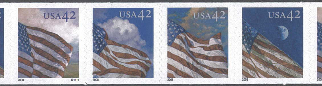 | Scott # 4239a | Strip of 4, Plate # S1111, on the 'Sunrise' flag stamp. |