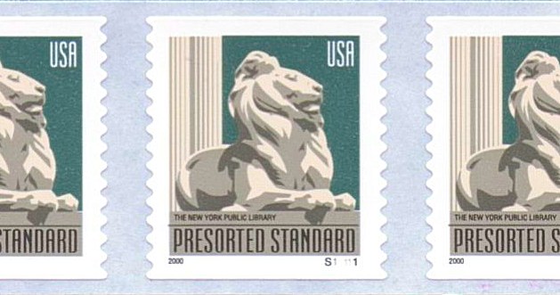 | Official Announcement | This stamp features one of the two lions guarding the entrance to the New York Public Library. Sculpted by Edward Clark Potter, these trademarked beasts - nick-named Patience and Fortitude - have been adopted by the library as official mascots. |