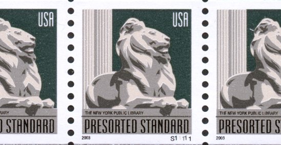| Official Announcement | This stamp features one of the two lions guarding the entrance to the New York Public Library. Sculpted by Edward Clark Potter, these trademarked beasts - nick-named Patience and Fortitude - have been adopted by the library as official mascots. |