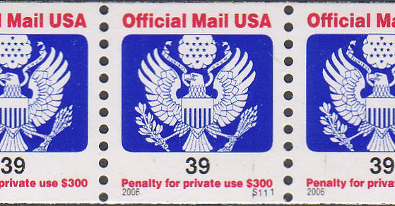 | Official Announcement | The Postal Service will issue a 39-cent Official Mail definitive in a water-activated gum (WAG) coil of 100 stamps (Item 780900), on March 8, 2006, in Washington, DC. The stamp, designed by the late Bradbury Thompson, also goes on sale nationwide March 8, 2006. |