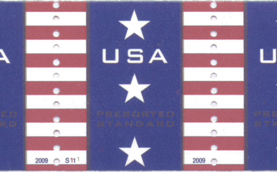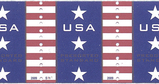 | Official Announcement | On February 24, 2009, in Washington, DC, the Postal Service™ will issue a non-denominated, presorted standard rate (10-cent value), Patriotic Banner stamp in one design in a water-activated gum (WAG) coil of 500 stamps (Item 787400). Designed by Michael Osborne of Berkeley, California, the stamp goes on sale nationwide February 24, 2009. This stamp was previously issued in the following formats: