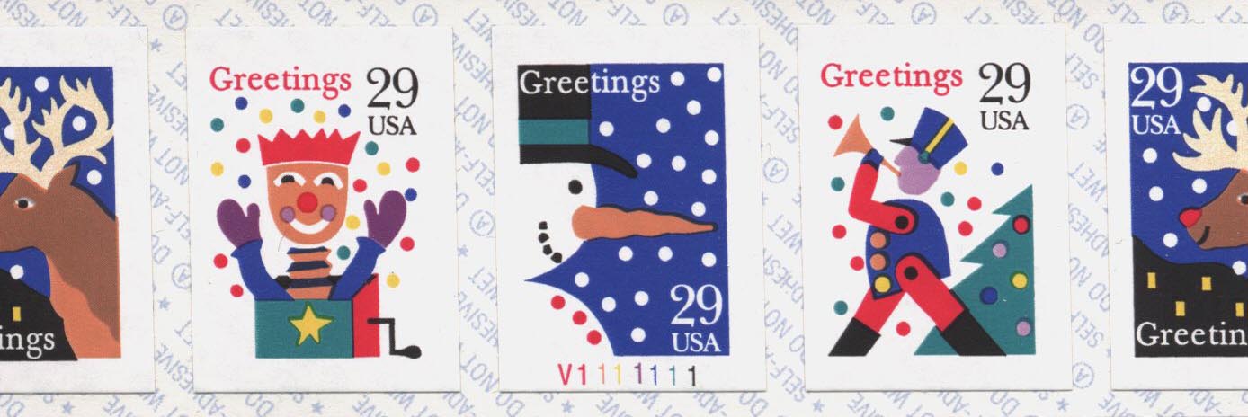 | Scott# 2799-2802 | Plate # V1111111 - The Snowman stamp, #2801, has the plate number on it. |