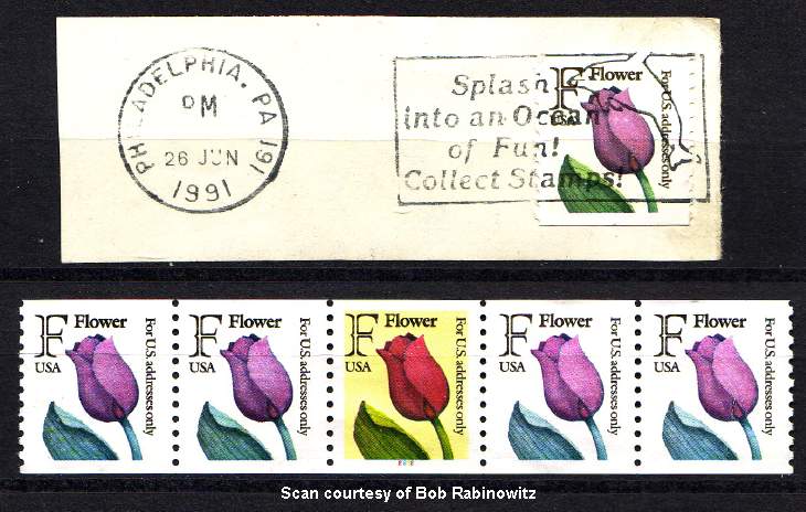 Purple ink was used in tests in the 1970s for canceling purposes because the existing black ink often jammed machines and slowed down operations. Purple ink was used in 131 cities primarily from 1980 thru 1983. It was criticized because it was hard to read and would run and discolor stamps and the cancel could be washed off stamps. It was phased out when a new black ink was developed in 1982. Here is a list of Plate Number Coils with Purple Machine Cancels. Die cutting from a new design of a die mat, but still exhibits the same peak counts as the original. For example, a mat that On a self-adhesive stamp, the section of the die cut that normally would be between two rows on properly sliced coils. This section can be: straight, either horizontal or vertical; slanted, either sloped left or right; or a half height dome shaped cut called a knoll. The straight section could be vertical (on a horizontally formatted coil), horizontal (on a vertically formatted coil), or at an angle, sloping to the left or the right. The Knoll Die Cut Row Separator will appear on a single stamp as either a half-height dome or a valley. See also Die Cut Row Separator.Water activated stamp adhesive (WAG) that displays a moderate degree of light reflection. Sometimes referred to as Low Gloss or Semi-gloss Gum. This falls into the range between Dull Gum and Shiny Gum. Each year, Scott Publishing Co., issues two catalogs containing information on Plate Number Coils. The Scott Standard, Volume 1, comes in the Spring. The Scott Specialized appears late in the year and is more comprehensive in its coverage of PNCs. Both use the Scott numbering system, which is accepted worldwide. A colored line or lines between two coil stamps caused by ink build-up deposited on the printing blanket from the edge of the offset plates. The lines can vary from very light to very dark and run the range of the colors on the stamps being printed. See also Joint Line, Gap and White Paper Line. The reverse side of a stamp that is coated with a pressure sensitive coating that sticks without the use of moisture. Most US Self-Adhesive coil stamps are sold on a removable liner. The unprinted paper surrounding the coil stamp. The term also refers to the paper that borders sheets and panes of stamps as they are printed. Water activated stamp adhesive (WAG) that displays a moderate degree of light reflection. Sometimes referred to as Low Gloss or Satin Gum. This falls into the range between Dull Gum and Shiny Gum. Precancels started out with two lines across the face of the stamp. Eventually the bars were eliminated in favor of service inscription overprinted or incorporated in the stamp design. The Postal Service still refers to these as precancels, but the generally accepted term is 'Service Inscribed' stamps. Precancels used by bulk mail permit holders do not require any additional cancellation. Precancels or Service Inscribed stamps used by collectors with a 'Precancel User's Permit' do require dated cancels at the time of mailing. Two or more stamps of different designs or types that are attached. Sennett Security Products (SSP) Sennett is a security printer contracted by the USPS to print postage stamps. Sennett, in late 2015, purchased the stamp printing operations of CCL Label, and its subsidiary, Banknote Corporation of America, to produce postage stamps under USPS contract. Plate numbers on stamps are prefixed by āSā. Shallow Valley Die Cut Row Separator A die cut feature resulting from the misalignment of the die cut mat with respect to the stamp image on the printed web. The shallow valley looks similar to a valley, but is shorter, and occurs when the shape of the die cutting transitions from a VP to PV on adjacent strips from the web. On coils with vertical serpentine die cuts, this feature is always found at the upper left (top) or lower left (bottom) of the stamp. On coils with horizontal serpentine die cuts, the feature is always found either top right or top left. (See Fig. 8.) Shallow valley die cuts occur only on stamps produced by Avery Dennison. More information can be found in the catalog chapter Avery Die Cut Varieties. Water activated stamp adhesive (WAG) that displays a moderate degree of light reflection. Sometimes referred to as Low Gloss or Satin Gum. This falls into the range between Dull Gum and Shiny Gum. Water activated stamp adhesive (WAG) having a high light reflective appearance. Sometimes referred to as wet gum. On a self-adhesive stamp, the section of the die cut that transitions from the serpentine die shape to the straight die shape. Shoulders are known to be either rounded or squared (at a 90° angle). Click here to see examples. Material, usually glue or a similar substance, incorporated into all finished papers during manufacture to keep the ink from bleeding through the paper fibers and to add stiffness. A perforating process used by Sennett Security Products (SSP) which employs truncated cones (with slightly rounded tops) on the form cylinders that push on the stamp paper from the front while steel rotary cutting blades scrape off the paper from the rear. There are three staggered sets of cylinders and cutters, the last two downstream of and overlapping the preceding set. The three sets together span the entire width of the paper web. Misalignment of the overlap causes crooked (offset) hole rows, snowmen, and the overlap can cause hole size variation within a single stamp if one of the cylinders is worn more than the other. Wear of the cones due to contact with the paper causes smaller perf holes, not larger holes. Wear reduces the height of the cones, causing less paper to be removed and thus a smaller hole. See Snowman Perforations. A seamless steel cylinder used in line engraved intaglio printing. The images to be printed are entered directly on the curved surface. The mechanism for separating the printed web into individual rows to form continuous strips that are cut to length and rolled into coils. S