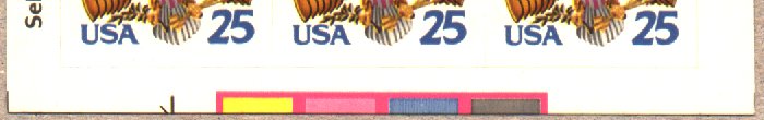 to determine it correctly. Liner printing was eliminated in 1996. Note that the printing on the 36/54° example on the left does not go from corner to corner as it does on the 45° examples above. Also remember that stamps are not square as these illustrations are. |