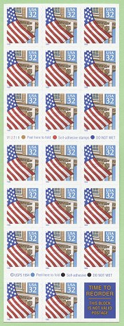 Marginal Markings | Plate Numbers · "Peel here to fold · Self-adhesive stamps · DO NOT WET" · "©USPS 1994" · On non-stamp label: "TIME TO / REORDER / THIS BLOCK / IS NOT VALID / POSTAGE." |