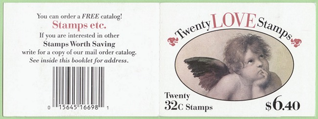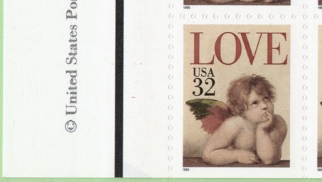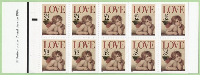 Official Announcement | The Postal Service will issue 32-cent and 55-cent Love (Cherub) stamps on May 12 in Lakeville, PA. Designed by Terry McCaffrey of the Postal Service, the Love stamps feature one of two cherubs from Raphaels Sistine Madonna painting. The 32-cent Love stamp will be available in a pane of 50 or a single stamp (Item 5595) and a $6.40 booklet of 20 (Item 6665). The 55-cent Love stamp will be available also in a pane of 50 or a single stamp (Item 5504) and a convertible booklet of 20 self-adhesive stamps (Item 6644). The Love (Cherub) stamps go on sale nationwide on May 13. |