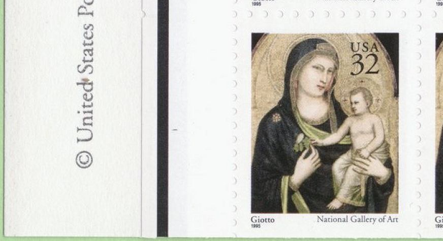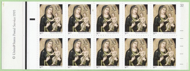 (Madonna and Child) commemorative stamps on October 19 in Washington, DC. Designed by Richard D. Sheaff, of Boston, Massachusetts, both the pane and the booklet of stamps feature Florentine artist Giotto di Bondones Madonna and Child, which dates to the early fourteenth century. The painting, which is part of the Samuel H. Kress Collection in the National Gallery of Art in Washington, DC, was created on wood as the central part of a five-section altarpiece. The Madonna and Child holiday traditional stamps go on sale nationwide October 20. |