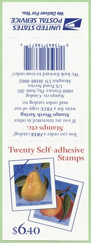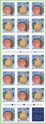 Official Announcement | The Postal Service will issue a 32-cent The Postal Service will issue the 32-cent Fruits (Peaches & Pear) stamps in a $6.40 booklet of 20 (Item 6663), and a $6.40 convertible booklet of 20 self-adhesive stamps (Item 6671) on July 8 in Reno, NV. The stamp booklets go on sale nationwide on July 10. The stamps were designed by Ned Seidler of Hampton Bay, NY. |