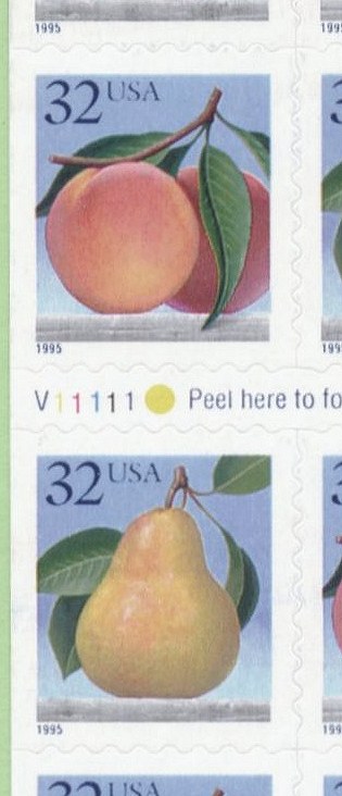The 32-cent Fruits (Peaches & Pear) self-adhesive convertible booklets go on sale July 8, 1995, in Reno, NV. This issue has two designs, peaches and a pear. A future Postal Bulletin will include collector information.