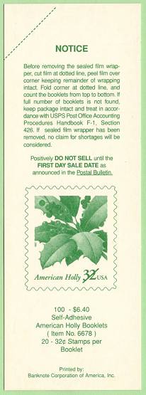 issue a 32-cent American Holly stamp, in self-adhesive vendible booklets of 15 (Item 6688)