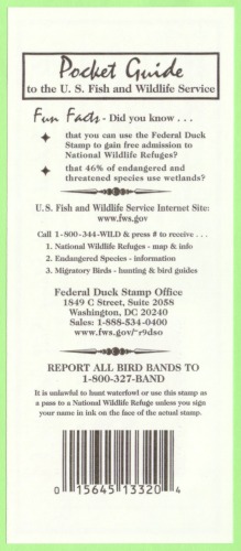 Barrow's Goldeneye U.S. Department of the Interior." BACK: "Invest in America's Future. Buy Duck Stamps. Save Wetlands. Send in or report all bird bands to 1-800-327-BAND. It is unlawful to hunt waterfowl or use this stamp as a pass to a National Wildlife Refuge unless you sign your name in ink on the face of this stamp." |