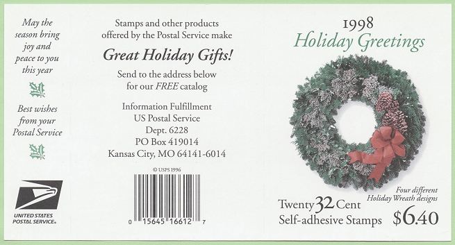issue four 32-cent Holiday Contemporary: Wreaths Special Stamps, in a pane of 20 (Item No.