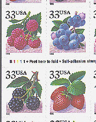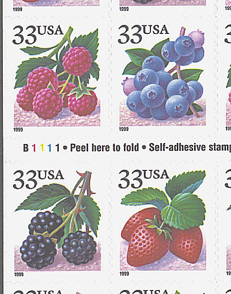 Official Announcement | The Postal Service will issue four 33-cent Fruit Berries Definitive Stamp (Item Number 775700) in Ponchatoula, LA, on April 10, 1999. The Fruit Berries stamps were designed by Howard Paine of Delaplane, VA, and illustrated by Ned Seidler of Hampton Bay, NY, and go on sale nationwide April 11, 1999. |