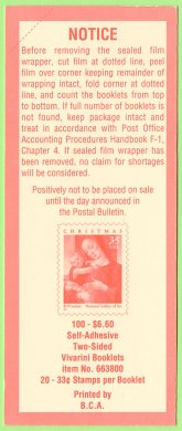 Stamp distribution offices (SDOs) and stamp distribution networks (SDNs) will receive an approximate full automatic distribution for the 20-stamps-per-booklet issue. Distributions are rounded up to the nearest master carton size (4,500 booklets).