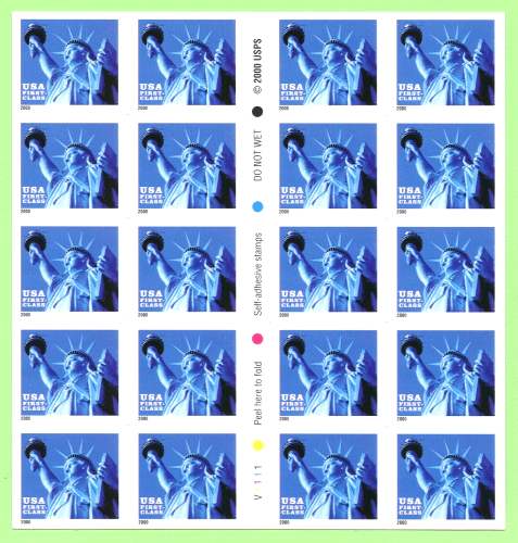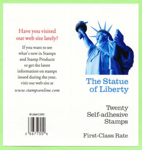 Official Announcement | The Postal Service will issue a Statue of Liberty nondenominated definitive stamp in Washington, DC, on December 15, 2000. The stamp will be issued in a self-adhesive booklet of 20 (Item Number 667700), a self-adhesive vending booklet of 20 (Item Number 669900), a gummed coil of 3000 (Item Number 770800), and a pressure sensitive adhesive (PSA) coil of 100 (Item Number 770700). The stamp, designed by Derry Noyes of Washington, DC, based on a photograph by Paul Hardy of New York, NY, goes on sale nationwide December 15, 2000. (No ceremony will be conducted.) The Statue of Liberty, a gift of friendship from the people of France to the people of the United States, has become a symbol of freedom and democracy. Located in New York Harbor, the statue was dedicated on October 28, 1886, and designated a National Monument on October 15, 1924. This stamp is a new addition to the many images of the Statue of Liberty on U.S. postage stamps. |