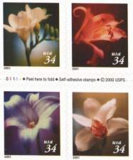 Official Announcement | The Postal Service will issue a set of four 34-cent Flowers definitive stamps in New York, NY 10199, onFebruary 7, 2001. These stamps will be issued in a vending booklet of 20 (Item Number 669400); a self-adhesive two-sided booklet of 20 (Item Number 669200); and a self-adhesive coil of 100 (Item Number 776900). These stamps, designed by Derry Noyes of Washington, DC, are based on photo- graphs by Robert Peak of Winter Park, FL, and go on sale nationwide February 8, 2001. The photographs by Robert Peak capture the color and delicacy of four different cut flowers - a freesia, a cymbidium orchid, and two lilies. In his 25 years of artistic endeavors, Peak has been recognized and honored as a photographer, designer, and filmmaker. His fine art photographs have been featured in major publications and appear in collections worldwide. |