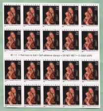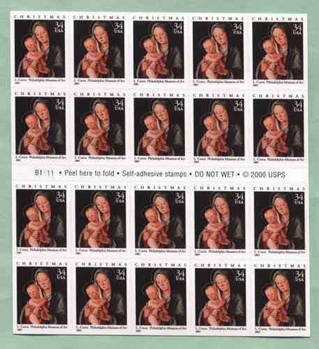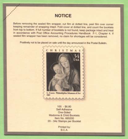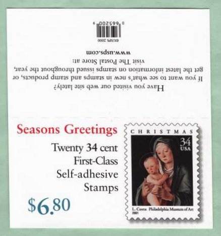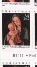 Official Announcement | The Postal Service will issue a 34-cent Christmas:Virgin and Child stamp (Item Number 665200) in a self- adhesive, double-sided convertible booklet of 20, in Philadelphia, Pennsylvania, on October 10, 2001. The stamp, designed by Richard Sheaff of Scottsdale, Arizona, and based on a painting by artist Lorenzo Costa, goes on sale nationwide October 11, 2001. Coinciding with the 125th anniversary of the Philadelphia Museum of Art in 2001, this latest offering in the Holiday Celebrations series features a detail of Italian Renaissance painter Lorenzo Costa's oil-on-panel Virgin and Child, circa 1490. Lorenzo Costa is well represented in major European galleries; this painting is a rare example of Costa's work in an American museum. |