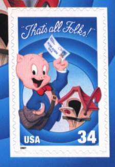 Official Announcement | The Postal Service will issue a 34-cent "That's All Folks!" commemorative stamp (Item Number 560200) in Beverly Hills, California, on October 1, 2001. The stamp, designed and illustrated by Ed Wleczyk of Los Angeles, California, goes on sale nationwide October 2, 2001. The stamp will be produced in souvenir sheets of 10; the souvenir sheet may not be split and the stamps may not be sold individually. The first true star of the Looney Tunes case, Porky Pig is popular with audiences of all ages and has appeared in more than 160 cartoons. Porky Pig experienced several changes in his early years appearing as child, father, and young suitor in succeeding cartoons. Later, he became a more consistent personality with a gentle stammer, wide-eyed appearance, and boyish nature. Eventually, Porky Pig was redesigned as a more adult-looking character and cast as a wry foil for the silly Daffy Duck. Porky Pig, already a famous star, was guaranteed immortality when he was chosen to deliver his famous phrase "That's all Folks!" at the end of the LooneyTunes cartoons. Porky Pig completes the Postal Service's Looney Tunes series. |