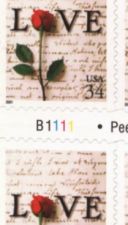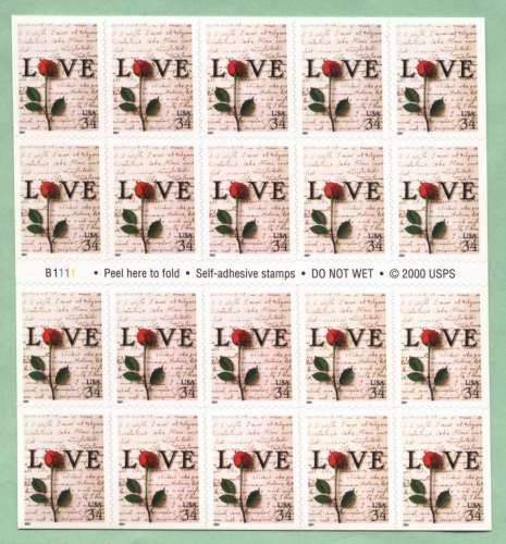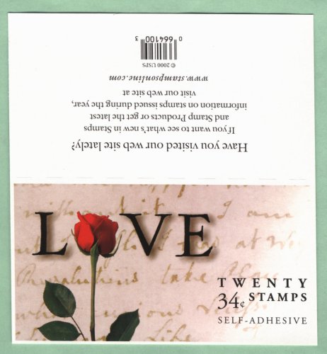 DC, go on sale nationwide February 15, 2001. These stamps celebrate the art of letter writing and the centuries-old tradition of expressing love in letters. The stamps are intended for use on Valentine's Day correspondence, as well as on wedding invitations, announcements, and RSVPs. The vertically formatted 34-cent stamp bearing the First-Class, one-ounce rate depicts a red rose superimposed on the script of a handwritten letter from John Adams to Abigail Smith during their courtship. John Adams, who was President from 1797 to 1801, and Abigail Smith were married in 1764. |