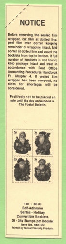Authorized philatelic centers requiring the $6.80 Holiday: Santas PSA double-sided booklet of 20 must order Item Number 665100 from their designated SDO using a separate PS Form 17.