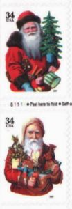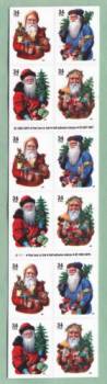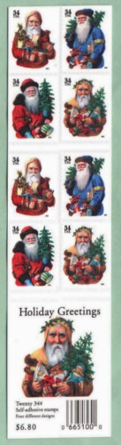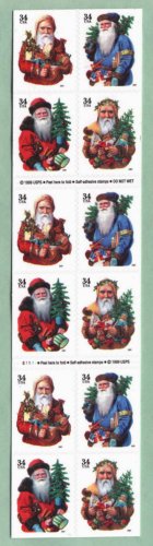 Official Announcement | The 2001 Holiday: Santas stamps feature four images (circa 1915-1920) that represent part of the rich folklore of Santa Claus. Over the centuries, numerous cultures have contributed to the legend, and these images are part of that tradition. The story of Santa Claus begins with St. Nicholas, a fourth-century bishop in Asia Minor. St. Nicholas was considered a generous gift giver and protector of children and his reputation flourished throughout Europe. When the Dutch landed in the New World, they named St. Nicholas - Sinterklaas in Dutch - as their patron. In America, the Dutch legend of Sinterklaas merged with the English tradition of Father Christmas, creating the character that we know today as Santa Claus. |