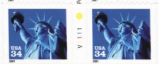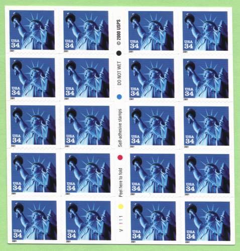 Official Announcement | The Postal Service will issue a Statue of Liberty 34-cent definitive stamp in New York, NY 10199, on February 7, 2001. The stamp, designed by Derry Noyes of Washington, DC, is based on a photograph by Paul Hardy of New York, NY, and goes on sale nationwide February 8, 2001. This stamp will be issued in six formats: a convertible booklet of 20 (Item Number 669800); a convertible booklet of 10 (Item Number 669500); a vending booklet of 20(Item Number 669000); a self-adhesive coil of 100 (Item Number 771300); a water-activated coil of 10,000 (Item Number 773800); and a water-activated coil of 3,000 (Item Number 773700). The Statue of Liberty, a gift of friendship from the people of France to the people of the United States, has become a symbol of freedom and democracy. Located in New York Harbor, the statue was dedicated on October 28, 1886, and designated a National Monument on October 15, 1924. This stamp was issued in several nondenominated formats in December 2000. |