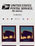 Official Announcement | The Postal Service will issue a 21-cent Bison definitive stamp (Item 102100) on September 20, 2001, in Washington, DC. The stamp goes on sale nationwide September 21, 2001. The stamp designed by Carl Herrman of Carlsbad, California, and illustrated by Tom Nikosey of Bell Canyon, California, has the same design as the Bison definitive stamp issued on February 22, 2001. The stamp will be issued in two new formats: self-adhesive convertible booklets of 10 (Item 662800) and vending booklets of 10 (Item 662900). |