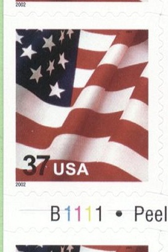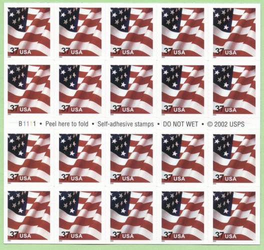 Marginal Markings | "Plate Numbers · "Peel here to fold · Self-adhesive stamps · DO NOT WET · "© 2002 USPS - (Cover side) barcode; U.S. Flag; misc. text " |