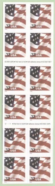 Official Announcement | The Postal Service will issue a 37-cent U.S. Flag definitive stamp on June 7, 2002, in Washington, DC. The stamp was designed and illustrated by Terrence W. McCaffrey, U.S. Postal Service, Washington, DC. No official ceremony is planned. The stamp will be issued in a pressure-sensitive adhesive (PSA) convertible book of 18 (Item 562600); PSA pane of 20 (Item 562900); PSA convertible book of 10 (Item 670600); PSA vending book of 20 (Item 670700); PSA double-sided book of 20 (Item 670800); PSA convertible book of 20 (Item 670900); PSA coil of 100 (Item 780100); PSA coil of 3,000 (Item 780200); PSA coil of 10,000 (Item 780300); water-activated gum (WAG) coil of 100 (Item 780500); WAG coil of 3,000 (Item 780600); and WAG coil of 10,000 (Item 780700). Items 780300 and 780600 will be available for nationwide sale on June 7, 2002. Items 562600, 562900, 670600, 670700, 670800, 670900, 780100, 780200, 780500 and 780700 will be available for sale at a later date. The stars and stripes of "Old Glory" are featured on this definitive stamp. |