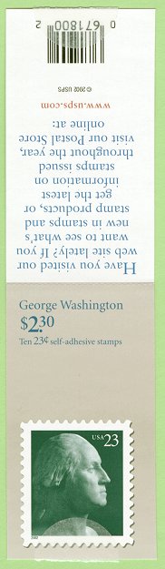 10 and PSA vending booklet of 10 will be available at a later date. The stamp, designed and illustrated by Richard Sheaff, Scottsdale, Arizona, was first issued on September 20, 2001, in Washington, DC, and available only in a PSA pane of 20 and a PSA coil of 100. Item 772000, 23-cent George Washington PSA coil of 100, previously manufactured by Banknote Corporation of America, is now being manufactured by Avery Dennison. |