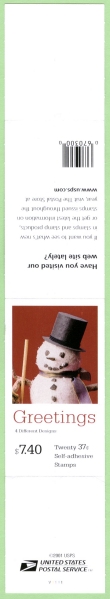 Marginal Markings | All peel off strips removed. Backside Markings: "© 2001 USPS" Plate numbers Price Barcode USPS Logo "Greetings 4 Different Designs Twenty 37c Self-adhesive Stamps Have you visited our web site lately?" |