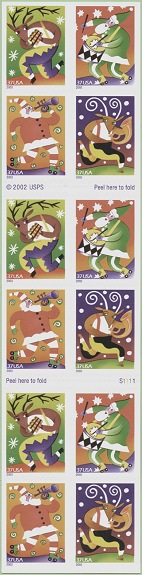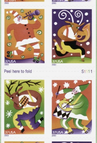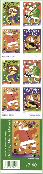 Official Announcement | The Postal Service will issue 37-cent Holiday Music Makers stamps in four designs on October 23, 2003, in New York, New York. The stamps, designed by Ethel Kessler, Bethesda, Maryland, go on sale nationwide October 24, 2003. Featuring whimsical Santas and fanciful reindeer playing horns, panpipes, and a drum, these lighthearted, colorful stamps are reminders of the joys of the season. Illustrator Diane Teske Harris of Billings, Montana, created the airbrush artwork for these colorful stamps. The Holiday Music Makers stamps will be issued in a pressure-sensitive adhesive (PSA) pane of 20 (Item 564000), a double-sided convertible booklet of 20 (Item 672200), a folded vending booklet of 20 (Item 672300), and a set of 20 stamped cards (883400). |
