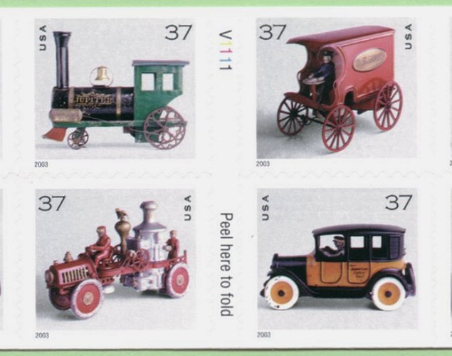 Official Announcement | The Postal Service will issue four 37-cent Antique Toys definitive stamps (Item 672500) in a pressure-sensitive adhesive (PSA) double-sided convertible booklet of 20 on September 3, 2003, in Washington, DC. The stamps, designed by Derry Noyes, Washington, DC, and photographed by Sally Andersen-Bruce, New Milford, Connecticut, will go on sale nationwide September 4, 2003. The Antiques Toys definitive stamps previously were issued on July 26, 2002, in a PSA convertible booklet of 20 (670400), PSA vending booklet of 20 (670500), and PSA coil of 100 (Item 780400). |