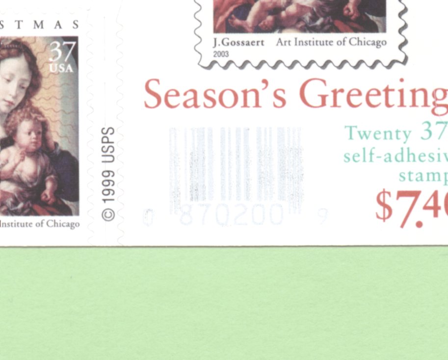 Marginal Markings | "©1999 USPS" Plate numbers "Peel here to fold" Price Barcode "Season's Greetings" Photo |